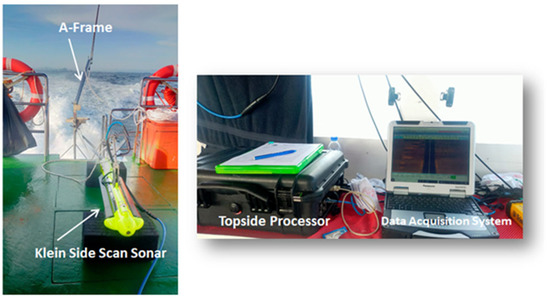 The side-scan sonar system comprises mainly the monitoring unit and a transducer towed at a certain depth using an extended cable attached to the rear of a survey vessel. The system works by transmitting sound pulses into the water to produce echoes or reflections of objects from the seafloor, known as backscatter [52]. The backscatter received by the transducers is then recorded, and varies in intensity based on the density of the material [29]. Subsequently, accurate results are obtained by synchronizing the data acquisition from the sonar and the global positioning system (GPS) navigation, as well as the image processing method. Given that the intensity of the sound pulse depends on the type and material of the detected objects on the seafloor, different materials produce different intensities, which are quantified in terms of the relative decibel (dB) value.