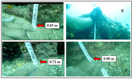 Sonar images from the scanning process conducted in 2006 and 2022 were used to compare the AR’s structure integrity, durability and height measurement. As mentioned in the methodology, the sonar range was set at 60–75 m to ensure that the structures were measured as accurately as possible. The height measurement of each BK AR module via the sonar images is shown in Figure 4. Expert interpretation of the sonar images revealed that the BK AR could be detected and outlined individually using the AR’s shadows on the seafloor. Figure 5 depicts the underwater image of a diver conducting the height measurement of the structure from the seabed, while Figure 6 shows the measurement of distribution areas of the AR modules. Following cross-examination to validate the AR measurements, the results showed that the heights of the BK AR were consistent for both years, ranging from 1.7 m to 1.8 m. This shows that the BK modules have not sagged into the sediment, and stand firm 19 years after deployment into the sea.