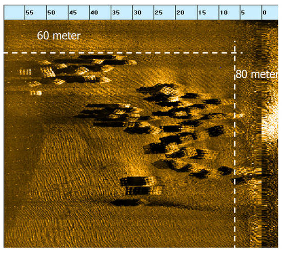 Currently, side-scan sonar is considered the most preferable technique to monitor both artificial benthic habitats and natural benthic habitats [28,29,30,31,32,33,34] given its reliable performance to locate and characterize AR structures [22,35]. Collier et al. [29] stated that the side-scan sonar is an excellent tool to assess the structure of AR following years of deployment on the seafloor. Furthermore, the method provides real-time imaging of the geographic reference of the reef modules with acceptable quality, which allows researchers to decide on how to survey future block deployments across large areas [36]. Additional reports on its applications related to fishery studies were given by Johnson et al. [37] and Kros et al. [38]. The application of the side-scan technique is also widely used in hydrographic surveys [39,40], archaeology mapping [41,42], seafloor mapping and marine geology [43,44], and physical oceanography [45].