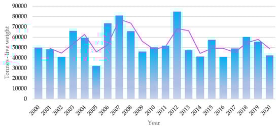 Global capture production of striped venus (Chamelea gallina) from 2000 to 2020. The purple line indicates the moving average value ([,] FishStatJ v. 4.02.06).