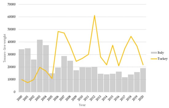In terms of total production, Italy is second only to Turkey; however, this trend is influenced by EU policies because, since 2006, when the Regulation (EC) No 1967/2006 [] was issued, imposing numerous restrictions on shellfish fisheries in EU countries, Italian production is no longer dominant compared to Turkish production but plays a minor role that is gradually decreasing until today (Figure 2).