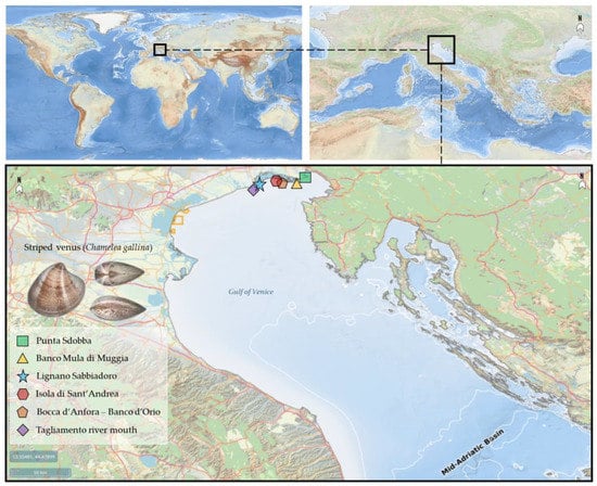 - Papetti, C.; Schiavon, L.; Milan, M.; Lucassen, M.; Caccavo, J.A.; Paterno, M.; Boscari, E.; Marino, I.A.M.; Congiu, L.; Zane, L. Genetic variability of the striped Venus Chamelea gallina in the northern Adriatic Sea. Fish. Res. 2018, 201, 68–78. [Google Scholar] [CrossRef]