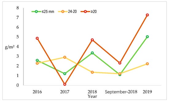 However, if we consider the average annual anomalies compared to the thirty reference years of climate from 1961–1990, 2018 ranks second in the entire series with an average anomaly of +1.08 °C []. The influence of environmental conditions on the biological cycle was also noted in the 2016 research campaigns, where mature specimens were also found in February; this phenomenon is due to energy requirements for reproduction. Energy reserves are important for reproduction, as the timing and rate of energy storage in clams depends mainly on temperature and food availability [].