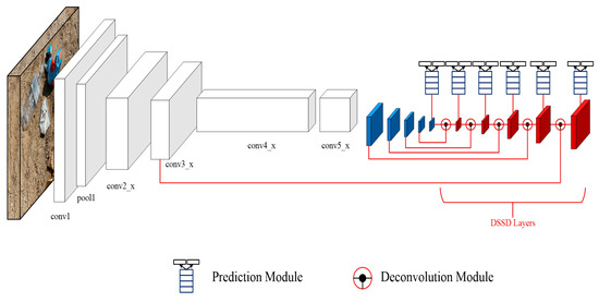 The original DSSD model based on the SSD model essentially makes the following two significant changes: (i) adopting ResNet101 instead of VGG16 as the feature extraction network, and (ii) introducing prediction modules to improve accuracy. In addition, it uses multiple deconvolution layers to expand the high-level feature information of the model. It performs an element-wise product with feature maps at the same scales of the front-end convolution layers to generate feature maps at the corresponding scales, which effectively improves the detection of small objects. The large depth of the original network framework and many fusion layers eventually lead to a decline in speed. The structure of the DSSD model is shown in Figure 3. The deconvolution module contributes to fusing the high-level and low-level feature mapping information. DSSD uses deconvolution layers instead of bilinear up-sampling and adds a normalization layer after each convolution layer. The residual unit is added to the SSD prediction module, and the original feature map is convolved in the residual bypass. Then the feature map of the network backbone is summed between channels to form a new prediction module.