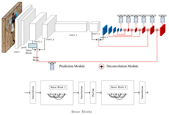 In the section, we discuss the proposed model, named MS-DSSD in this work. The MS-DSSD model is composed of a series of convolution and deconvolution layers with Residual-101 as the backbone and a deconvolution module to introduce spatial contextual information. The structure schematic diagram of MS-DSSD is shown in Figure 4. Dense blocks are applied behind the Conv2_x and Conv5_x layers, which can enhance the transferability of features. It also allows more efficient use of image features. Although the network is becoming complicated compared to DSSD, the number of parameters is small. Subsequently, the union of multiscale features is added at the Conv2_x and Conv5_x layers, increasing the model’s global and local feature information and extending the feature migration capability of dense blocks in object detection. In addition, focal loss functions and data augmentation are also introduced to improve the model’s performance.
