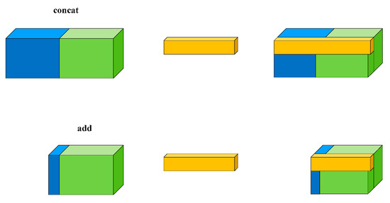 Object detection consists of two subtasks in computer vision tasks, object identification and localization. Image invariance and equivalence transformation are two essential properties in image feature representation. Efficiently combining the two, to utilize their strengths while discarding their weaknesses, is the key to improving the model. In the model, low-level features have higher resolution and contain more location information, but they are less semantic and noisier because they undergo less convolution. However, the high-level features have stronger semantic information but very low resolution and poor perception of details. Usually, feature fusion consists of concatenating and adding, as shown in Figure 5. Connection increases the number of channels while adding is the summation of feature maps with the same number of channels. Adding increases the amount of information under the features describing the image, but the number of dimensions describing the image itself has not increased, which is beneficial for the classification of the final image. However, concatenating is the merging of the number of channels. The number of features (number of channels) describing the image itself is enlarged, while the information under each feature is not. So, in the latter, contextual feature fusion is applied. The concatenating algorithm is defined in (1). Suppose two input channels X1, X2, …, Xc and Y1, Y2, …, Yc. K stands for convolution kernel. Then, the individual output channels are combined. (* denotes convolution). Conv2_x goes through the dense blocks and Conv3_x is for feature fusion, Conv5_x and Conv6_x are for feature fusion, and the next is similar to DSSD in the model as illustrated in Figure 4. Experiments have shown that that the fusion of features at different scales is a significant means to improve detection performance.