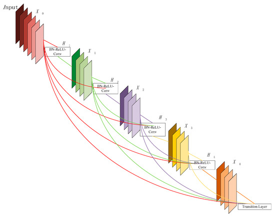 where is defined as a complex function of three concurrent actions, batch normalization rectified linear unit, and convolution. denotes the connection of the feature maps generated in layers . This approach can facilitate the building of deeper layers of network structures. Some features extracted from earlier layers may still be used directly by deeper layers. Each layer in the dense blocks receives supervision from the loss and has multiple bypasses and shortcuts. Therefore, the supervision of the blocks is diverse, which causes the network to obtain better features.