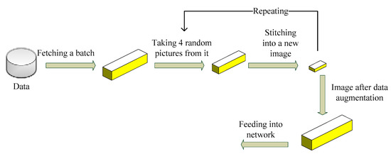 As the neural network deepens, the number of parameters to be learned increases, which can easily lead to model overfitting. When the data set is small, the parameters can fit all the characteristics of the data sample instead of the commonality between the samples. To prevent the overfitting phenomenon, data augmentation enables limited data to produce value equivalent to more data. Data augmentation methods commonly include random rotation, random cropping, horizontal flipping, and scale. In this work, Mosaic is employed to increase the diversity of the sample and avoid model overfitting. Figure 7 describes the basic principle of Mosaic. The core idea of data augmentation is to take four images and stitch them together by random scaling, random cropping, and random lining up. The advantage of Mosaic is that it can significantly enrich the detection dataset, especially using random scaling, which can add many small targets. Thus, it makes the network more robust. Batch normalization can calculate four data images at a time, so that the mini-batch size does not need to be large, which helps the single GPU to achieve better results.