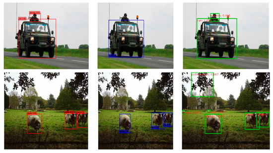 The learning rate was fixed to 1 × 10−3 at the beginning of iteration and decreased to 1 × 10−4 as the iterations increased to 40 K. The experiments were related to Residual-101, which is a fast convergence model. Table 1 shows the result of PASCAL VOC2007 test detection. SSD300* and SSD513* are the most recent SSD achievements with new extended data enhancement techniques that are already superior to many other state-of-the-art detectors [11]. MS-DSSD321 adds feature fusion and dense blocks and modifies loss function and the data enhancement method, compared to the original DSSD321 model [26]. The result shows 1.7% better performance than DSSD321. Interestingly, when we increased the input image size, MS-DSSD513 resulted in the best accuracy, outperforming DSSD513, DSSD321, and MS-DSSD321 by 0.7%, 3.6%, 1.9%, respectively. There are several reasons for this. Residual-101 needs more effective features for objects in the deeper layers to obtain spatial information. More importantly, because we incorporated feature fusion and dense blocks into DSSD, the model also addressed the class balance issue with focal loss function. These techniques allow the model to encompass more contextual information, focus on the tasks concerned more with this work, and mitigate the gradient disappearance problem, which prove the validity of our proposed method. The test results are shown in Figure 8. Due to space limitations, we show only a diagram of the detection results of the three models on the PACAL 2007 test set. The red test boxes on the left represent the test results of the SSD321, the blue boxes in the middle are the result of DSSD321, and the green boxes on the right are the result of MS-DSSD321. As shown in the results, MS-DSSD321 outperforms other methods in both detecting small objects and in object integrity.