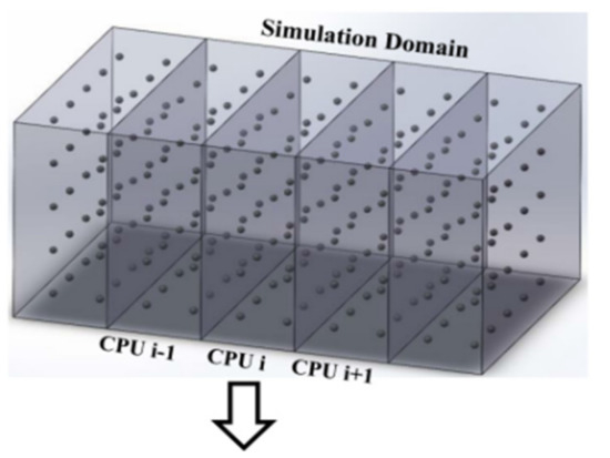 Due to the large amount of storage space and the large number of SPH particles required, three-dimensional SPH simulations for the sediment dispersion on the ocean scale are extremely challenging. For this reason, a parallel algorithm based on the memory distributed message passing interface (MPI) platform is proposed. Accordingly, the simulation domain is divided into domain components along the longest side in the x direction. The length of each component is , which is processed by a , as shown in Figure 3. The detailed parallel method is introduced by Tran-Duc et al. [17].