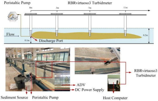 In order to verify the rationality of the SPH simulation, a lab-scale water-channel experiment was carried out, as shown in Figure 4. We adopted a water channel with the dimension, . A bentonite–water mixture with the concentration of () was prepared to simulate the natural sediment. The bentonite particle has a similar density () and the particle size distribution to the natural sediment particles. A peristaltic pump was used to discharge the bentonite-water mixture placed in the beaker into the water channel through a tube, and the discharging port was located in the middle between side walls of the tank, and is from the bottom of the channel with adjustable discharging rate by controlling the rotational speed of the pump. Four turbidimeters (RBRmaestro3, RBR, Canada, measuring range from to with the error less than ) were deployed in the downstream area as shown in Figure 4 to evaluate the concentration of sediment particles in the plume at different distances from the source. The flowing velocity in the channel was set to . Since the experiment was limited by length of the channel, the turbidity can only be measured at the maximum dispersion distance of .