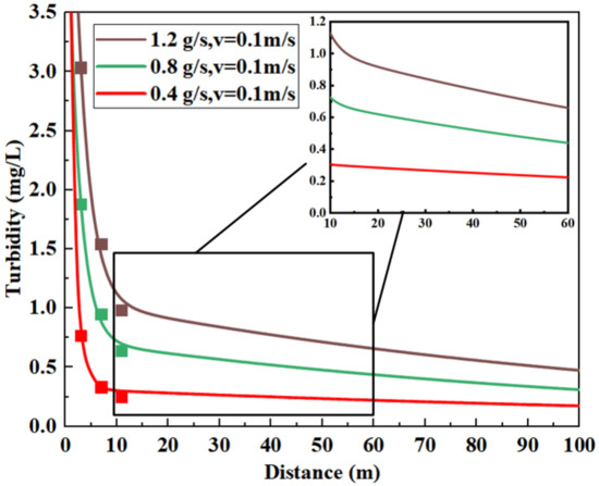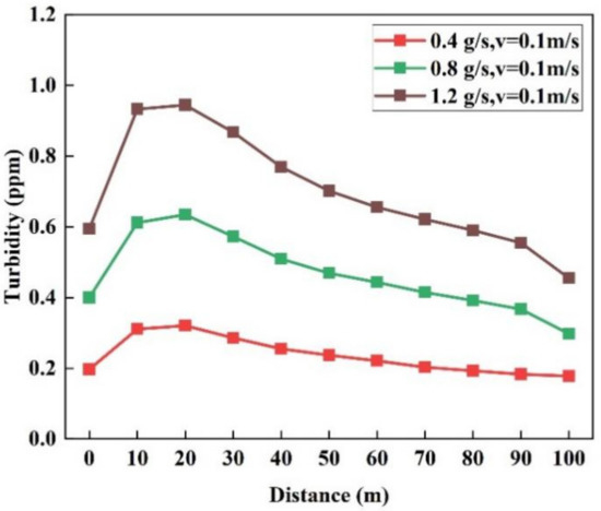 The reliability of this numerical simulation was first checked by the laboratory experiment introduced above. As shown in Figure 5, in the experiment that with increasing releasing rate from to , the concentration in the sediment plume increases within the discharging distance investigated. For comparison, the numerical simulation adopting the same working condition was applied. The calculation domain in this case, . As shown in Figure 6, change of the solid concentration with the dispersion distance was calculated at the height of above the bottom boundary in the center of the channel. Comparing Figure 6 with Figure 5 it can be observed that evolution of the turbidity with the dispersion distance is different at the distance smaller than , which is due to different manners of sediment discharging method applied in the experiment (releasing at the height of ) and in the numerical simulation (releasing at the bottom boundary), and therefore, the peak turbidity was not captured at the height of in the simulation. In order to validate roughly the simulation result at larger dispersion distance, evolution of the turbidity measured from the experiment was fitted by an empirical model , where is the dispersion distance from the source along the stream direction. , , , and are parameters to be fitted by the experimental data and listed in Table 3. Consequently, the sediment concentration at larger distance can be estimated, as shown in Figure 5. Comparing Figure 6 with Figure 5, it can be found that the concentration in the sediment plume calculated numerically is close to the lab-scale experimental result at the discharging distance larger than , showing that our numerical simulation captures reasonably the behavior of the sediment plume.