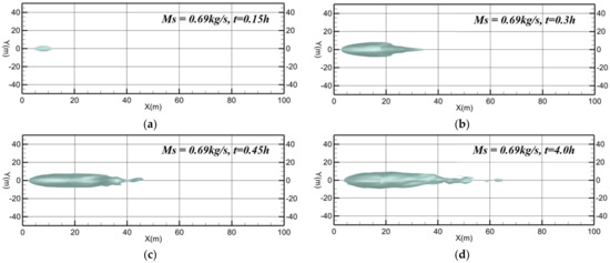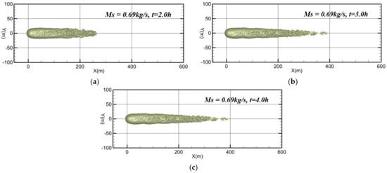 With increased to , as illustrated in Figure 9, for the sub-plume with , the behavior is similar, while the sub-plume becomes stable with the duration, , which is obviously longer than the condition when . Furthermore, the dispersion distance, X, increases considerably to , for the iso-surface of . From Figure 7, Figure 8 and Figure 9, it can be found that the behavior of the dispersion distance along y-axis, Y, follows the same trend as X, while Y is much less than X, and it becomes stable with a much shorter period of time.