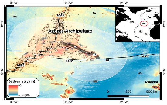 Geographic and geotectonic setting of the Azores Archipelago. NA: North American Plate; Eu: Eurasian Plate; Nu: Nubian Plate; MAR: Mid-Atlantic Ridge; TR: Terceira Rift; EAFZ: East Azores Fracture Zone; GF: Glória Fault; A-GF: Azores-Gibraltar Fault; SMA: Santa Maria: SMG: São Miguel; DJC: Dom João do Castro seamount; TER: Terceira; GRW: Graciosa; SJZ: São Jorge; PIX: Pico; FAI: Faial; FLW: Flores; CVU: Corvo. Geotectonic structures modified from Miranda et al. (2018). Coastline from the Portuguese Hydrographic Institute “https://www.hidrografico.pt/op/33 (accessed on 20 September 2022)” and bathymetry derived from GEBCO “https://www.gebco.net (accessed on 20 September 2022)”.