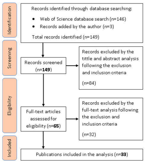 The screening process started with the analysis of the title and abstract of these 149 publications. Using the inclusion and exclusion criteria (Table 1), a total of 84 were removed (see Supplementary Material-Table S2). For the 65 remaining publications, the full text of each eligible article was then reviewed for relevance using the same inclusion and exclusion criteria as in the screening process. A total of 32 articles were removed, living a remaining total of 33 for further analysis.