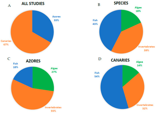The proportion of groups/taxa recorded in the articles included in the Azores and Canaries systematic review: (A) Proportion of studies for each archipelago; (B) Proportion of groups/taxa studies among archipelagos; (C) Proportion of groups/taxa studies in the Azores; (D) Proportion of groups/taxa studies in the Canaries.