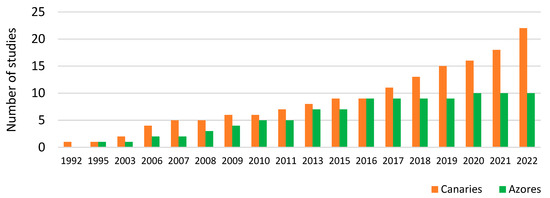In the supplementary material (Table S3), all the details of each of these studies can be consulted, including species, habitat, site, number of samples, size, tissue, sex, Cd content, and reference. Only the Azores and Canaries presented studies focusing on Cd in coastal species, in Madeira and Cape Verde they are absent, and the Canaries are leading mainly due to their work on fishes, while in the Azores, invertebrates are, by far, the most studied group (Figure 3 and Figure 4). The Canaries show a constant evolution in the number of studies over the years while the Azores seem to stabilize since 2016, reflecting a working group specifically focused on this topic. The University of the Azores has a research group (IVAR: Institute of Vulcanology and Risk Assessment) that focuses on ecotoxicology and human health issues linked to volcanism but from a more inland perspective. The marine and coastal realms are therefore subject to more spontaneous or circumstantial projects or other student works and theses.