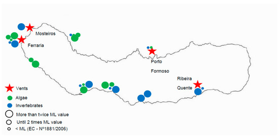 As a recently formed volcanic archipelago within the Macaronesia region, the Azores are surrounded by deep seafloor with a complex geotectonic setting where seismic–volcanic phenomena occur, reflected by lava emissions, diffuse degassing from soils, and hydrothermal activity [30,31]. Although important anthropogenic sources of heavy metal pollution are not known in the Azores, owing to the frequent seismic and volcanic activity, high inputs of heavy metals can be leached to seawater surrounding these islands, affecting marine organisms and being integrated into food webs, also reaching edible species [32,33,34]. High levels of heavy metals have been reported for several local species from thermal hot springs and volcanic littoral, more specifically Cd was detected at values higher than the maximum levels (MLs) set out in Regulation (EC) no. 1881/2006 for the EU [33,34].