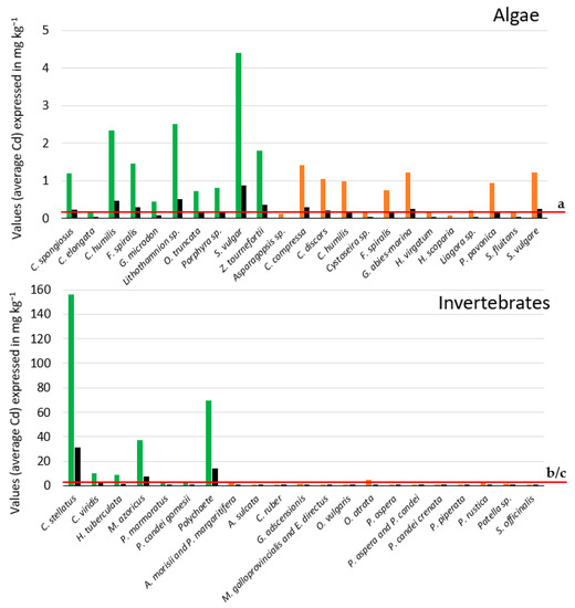 Cadmium content (mean mg kg−1 dry weight) according to several taxa. Green columns represent Azores studies, orange columns represent studies performed in the Canaries, and black columns represent values in wet weight. Red lines represent maximum levels of cadmium, in wet weight, according to Regulation (EC) No 1881/2006: (a) 0.05 (seaweeds), (b) 0.5 (crustaceans), (c) 1 (mollusks), and (d) 0.05 (fishes).