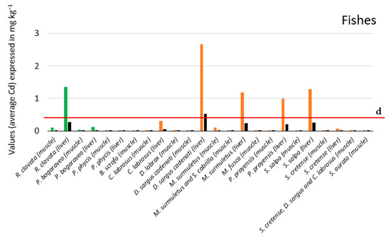 Fishes are very poorly studied, especially in the Azores. Although Cd preferentially accumulates in the liver, it is still essential to monitor these resources, which are very important at a socioeconomic level and part of the local diet; these include mostly benthic species with small home ranges: morays, groupers, parrotfish, seabreams, hogfishes, and even wrasses [48].