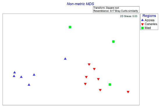 Non-mMDS, based on Bray–Curtis similarity of square root transformed data of the Cd content among algae, invertebrates, and fishes compared between regions (Azores, Canaries, and Mediterranean). Tests for differences between unordered regions groups (ANOSIM): Global Test Sample statistic I: 0.789; Significance level of sample statistic: 0.1%; Number of permutations: 999.