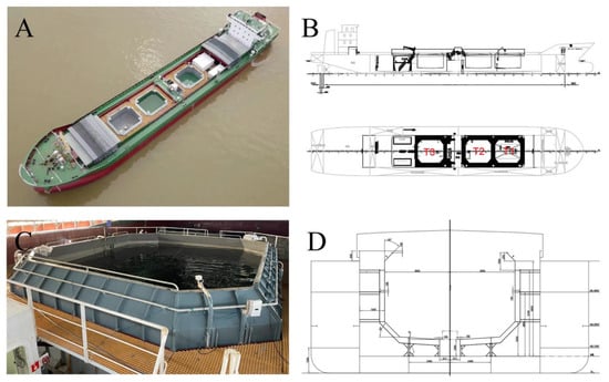 The mid-trial ship “Guoxin 101” was transformed from an offshore bulk carrier, with a total length of 96.8 m, a type of width of 16.6 m, a displacement of 5491 t (Figure 1A,B), a power of 2 × 662 kW, and a speed of 10.5 kn. It was equipped with three nearly quadrilateral breeding tanks with a volume of about 280 m3 (Figure 1C,D; 8.8 m ∗ 7.8 m ∗ 5.15 m; the water level was 4.1 m). There was a movable awning on the upper opening. The marine aquaculture system was mainly composed of water circulation, oxygenation, illumination, sewage, and monitoring and alarm systems.