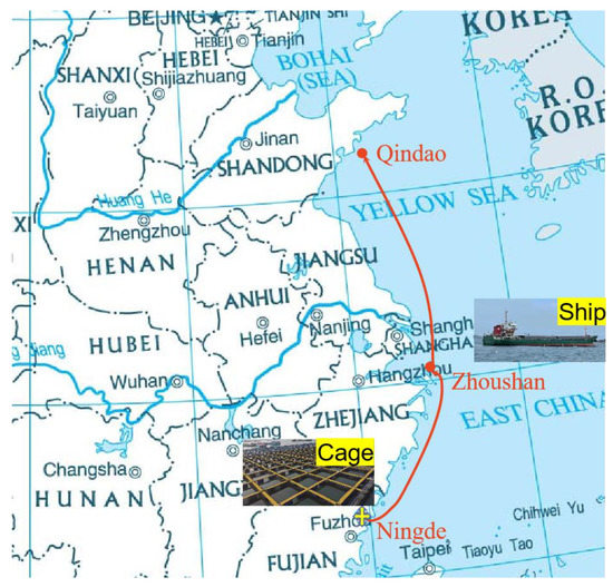 Location of experiment area in traditional aquaculture cages (marked with an orange star) and the anchorage location (marked with a red dot) and sailing route (marked with red lines) of the offshore aquaculture ship <http://www.gissky.net/map/ChinaZQYW.html, accessed on 8 November 2022>.