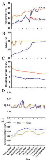 Comparison of water temperature (A), salinity (B), dissolved oxygen (C), pH (D), and ammonia nitrogen (E) in the ship and cages throughout the experiment period.
