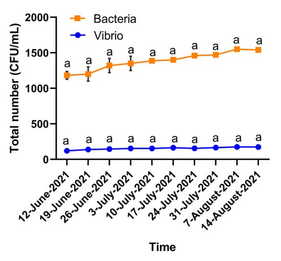 Changes in the total number of bacteria and vibrio in the fish tank of offshore aquaculture ship throughout the experiment period. Bars with different superscripts on the same microorganism are statistically different (p < 0.05, n = 3).