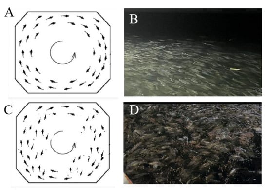 Swimming behavior of the large yellow croaker in the tank of the ship. (A,B) represent pictures and schematic images of the large yellow croaker colonies swimming against the current. (C,D) represent pictures and schematic diagrams of large yellow croakers swimming loosely while feeding, respectively.