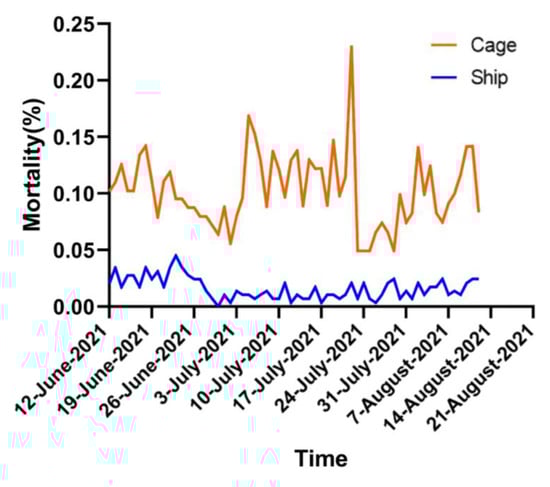 Through almost two months of on-site culturing, the change in the survival of the large yellow croaker was well documented (Figure 6). The result showed that no large-scale death events and serious disease conditions of the fish occurred in the two groups. However, the mortality rate of large yellow croaker in the cage group was relatively high, with the highest single-day mortality rate of 0.23%, which was higher than the highest single-day mortality rate of 0.05% in the ship group.