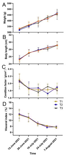 Body weight (A), body length (B), condition factor (C), and visceral index (D) in ranched large yellow croaker in the different tanks in an offshore aquaculture ship throughout the experiment period (n = 30); T1, T2, and T3 are represented as the three different tank.