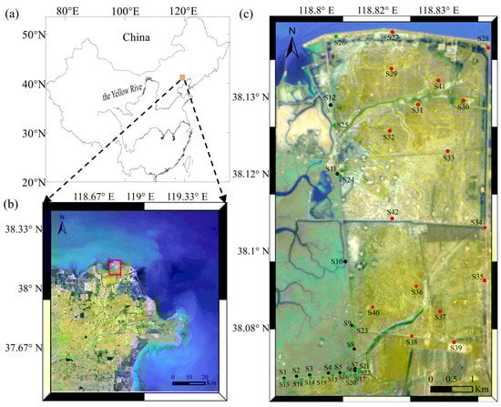 (a) Site of the Yellow River Delta (orange rectangle). (b) Map of the study area (red rectangle). (c) Distribution of measurement stations within the study area.