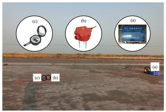 In the field test, the equipment used for ambient noise recording during the field investigation included a WZG-6A engineering seismograph for data acquisition, a PS-2B three-component velocity geophone with a dominant frequency of 2 Hz, and a compass, as shown in Figure 2.
