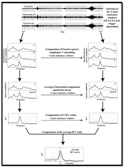 Flow chart shows the calculation steps of the HVSR. (http://www.geopsy.org/documentation/geopsy/hv.html) “URL (accessed on 10 November 2022)”.