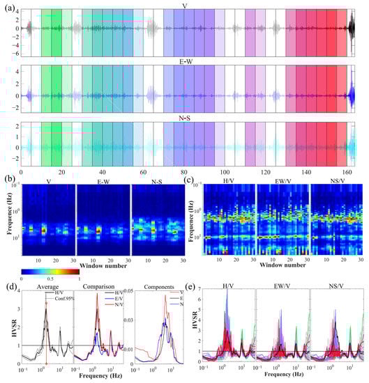 Processing result for S1. (a) Windowing. (b) Tiled view of Fourier spectra. (c) Tiled view of spectral ratios. (d) Average HVSR curve (left), H/V, E/V, and N/V ratios (center), the smoothed E, N, and V spectra (right). (e) HVSR curves for all windows, H/V, E/V, and N/V are shown from left to right.