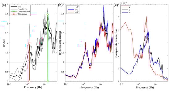 The identification of the fundamental frequency of S9 using the method of this paper and other method. (a) Average HVSR curve. (b) The H/V, E/V, and N/V ratios. (c) The smoothed E, N, and V spectra.