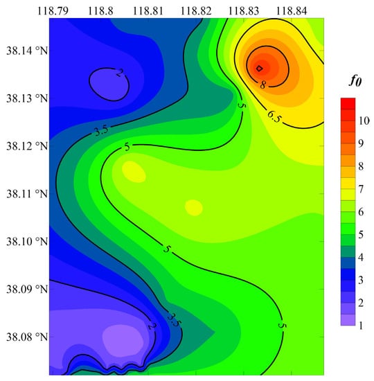 It has commonly been assumed that the distribution of f0 is closely related to geological conditions and depends mainly on shear wave velocity (Vs) and sediment thickness [,], which is related to the average vs. and inversely related to the sediment thickness. Figure 6 shows the distribution of the fundamental frequency of all stations, with f0 being distributed between 0.8 and 9.8 Hz and gradually increasing from southwest to northeast. The sediment thickness in the area gradually becomes thinner from southwest to northeast, and the distribution of fundamental frequencies is inverse to the thickness layer. This indicates that the fundamental frequency values identified by the new method are consistent with the geological conditions, which indicates the potential applicability and reliability of the new method.