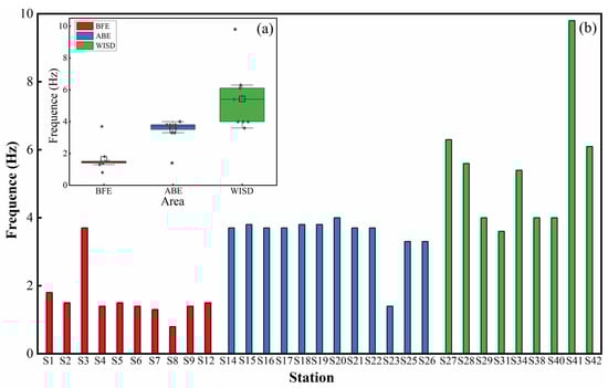 According to Figure 7, the stations in the BFE, ABE, and WISD areas have a stable distribution of the fundamental frequency values. It can be seen that the f0 values of stations in BFE are lower than the others and basically stay between 1.3 and 1.8 Hz, while S3 has a higher f0 of 3.7 Hz. This inconsistency may be related to the fact that this station is located on the back side of the seaward extending road, where the soils are less affected by wave-driven erosion and are more naturally consolidated than in other places. The f0 values of stations in ABE are basically centered around 3.8 Hz, while the f0 value at S23 is anomalous at 1.4 Hz. It is speculated that this f0 value is low because this station had been inundated with water before the test, resulting in loose soils and shallow groundwater levels; thus, the wave velocity and amplification are weakened when the S-wave reaches the surface. The distribution of f0 values in WISD ranges from 3.6 to 9.8 Hz, which ranges from middle to high levels.