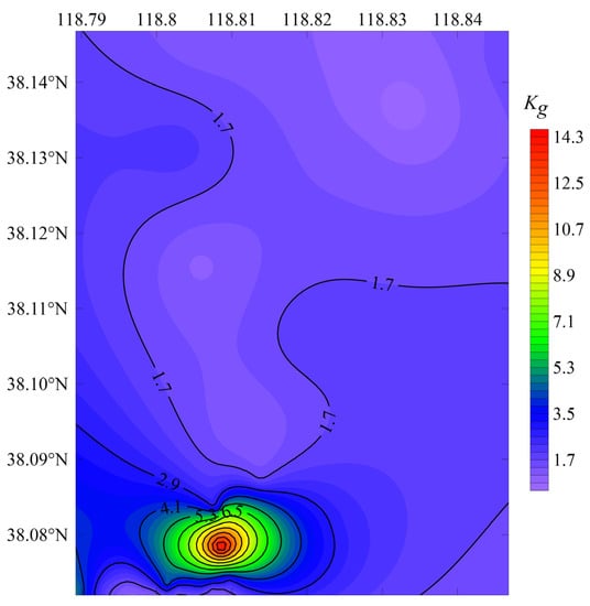 The vulnerability index value can be considered an indicator of the degree of deformation of the soil [], and it will help to detect weak points of the ground by comparing the Kg values at different stations. Figure 9 shows that the distribution of Kg ranges from 0.6 to 15.3, gradually decreasing from southwest to northeast, which is closely related to the local geological conditions. The Kg values on both sides of the embankment are in the range of 1.1–15.3, while the Kg values of the stations located on the wetlands are in the range of 0.6–2.7. Comparing Figure 6 and Figure 9, it can be seen that the distribution of Kg strongly coincides with f0, for which a high vulnerability index is usually found in the areas with low fundamental frequencies. The stations in BFE have a higher vulnerability index due to the damage caused by scouring and hollowing or the impacts of siltation on the stability of the soil.