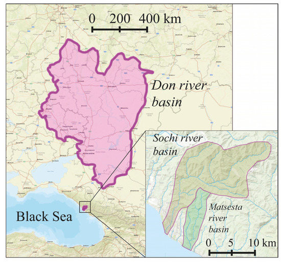 Watershed areas of the Don River (pink area), Sochi River (brown area at the inset), and Matsesta River (green area at the inset).
