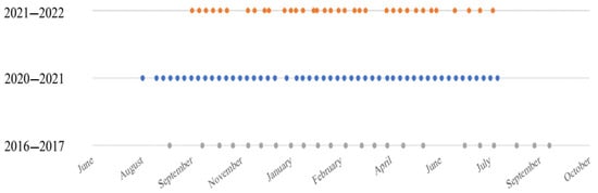 Observation dates on the Don River in 2016-2017 (grey points), on the Sochi River in 2020–2021 (blue points), and on the Matsesta River in 2021-2022 (orange points).