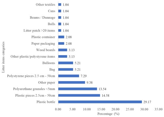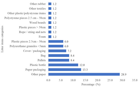 Monitoring at the Don River was performed from 3 September 2016 to 20 September 2017. During each observation period, the calculated litter flux varied from 6 to 101 items/h. Monthly averaged values varied from 9 to 59 items/h, while the annual averaged value was 23 items/h. The most common items detected at the Don River were other paper (28.9%), paper packaging (13.3%), plastic bottles (12%), bags (8.4%), pallets (8.4%), cover/packaging (7.2%), polyurethane granules (6%) and plastic pieces (6%) (Figure 2), and the most abundant materials were artificial polymers (45%) and paper/cardboard (42%) (Figure 3). The frequency of size classes is shown in Figure 4. More than 74% of litter items were smaller than 10 cm, while 46% of litter items were 5–10 cm (Figure 4).