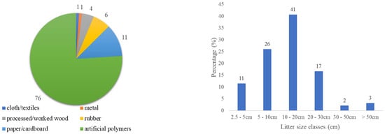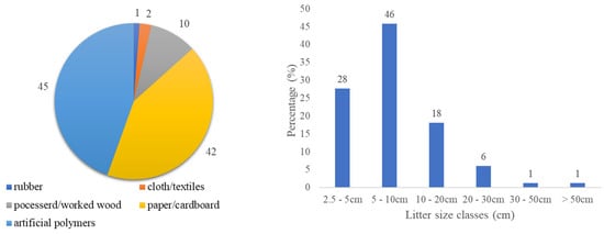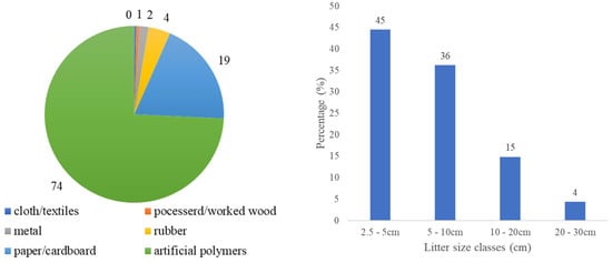 Percentage of materials of litter > 2.5 cm (left) and litter size classes (right) recorded at the Matsesta River.