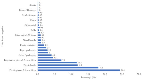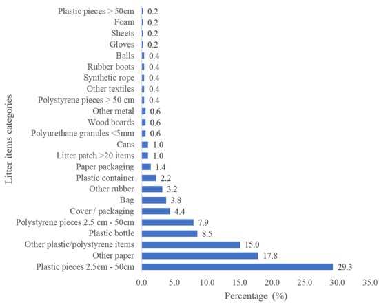 In general, during the monitoring period from 2016 to 2022 on the Don, Sochi and Matsesta rivers, 9289 floating objects bigger than 2.5 cm were identified; 92% of them were of natural origin, mainly leaves, while only 8% (714 items) were of anthropogenic origin. Most of identified litter items were smaller than 10 cm, except for the Matsesta River, where the most frequent size range was 10–20 cm. The most common detected items were ‘plastic pieces 2.5–50 cm’ (24.4%), ‘other paper’ (18.0%), ‘plastic bottles’ (11.8%), ‘other plastic/polystyrene items’ (11.7%), ‘polystyrene pieces 2.5–50 cm’ (7.0%), ‘bags’ (4.5%) and ‘cover/packaging’ (4.4%) (Figure 9).