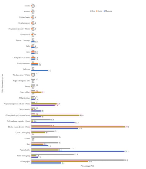 Percentage of recorded litter item categories at the Don, Sochi and Matsesta rivers.