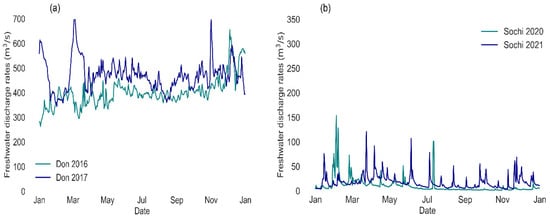 Freshwater discharge rates of the Don River during 2016–2017 (a) and Sochi River during 2020–2021 (b).