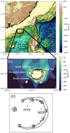 (a) A map showing the location of the Dongsha Atoll and (b) the modeling domain used in this study. The morphology of the Dongsha Atoll, including Dongsha Island, the north channel, the south channel, and the reef flat, is indicated in (b). The black lines represent a 1 m isobath to indicate the reef flat and the Dongsha Island. (c) A zoomed-in view showing the two measurement sites (H10 and N09) and the location indicators (A–I).