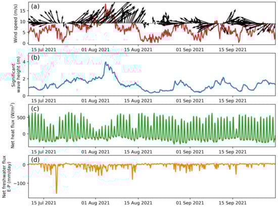 (a) Wind speed (red) and direction (arrows), (b) significant wave height, (c) net surface heat flux, and (d) net surface freshwater flux during the period of interest. Panels (a,c,d) were derived from ERA5, and panel (b) was derived from the MFWAM performed by Météo-France.
