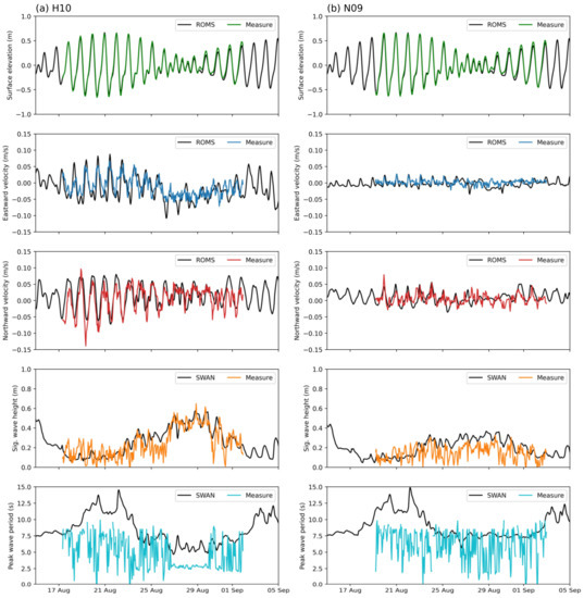 Comparisons of the modeled results against the observations at (a) site H10 and (b) site N09. From top to bottom: surface elevation, eastward depth-averaged velocity, northward depth-averaged velocity, significant wave height, and peak wave period.